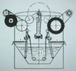 Tkanina se střídavě převinuje z jednoho válce (1) na druhý a při tom prochází zušlechťovací lázní (2). Napětí textilie se během převíjení reguluje (3) v rozmezí 0–100 kg.
