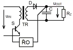 - Jednočinný blokující měnič (angl. buck) – topologie pro nízké výkony (do 250 W), malý počet součástek, používá transformátor se vzduchovou mezerou