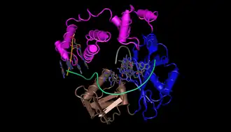 Vpravo DNA polymeráza I, vlevo Klenowův fragment, vzniklý částečnou degradací DNA polymerázy I