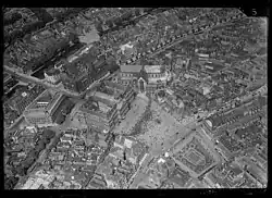 V.l.n.r.: het Nationaal Monument, De Industrieele Groote Club, Madame Tussauds, het paleis (midden) met daarnaast de Nieuwe Kerk, warenhuis De Bijenkorf