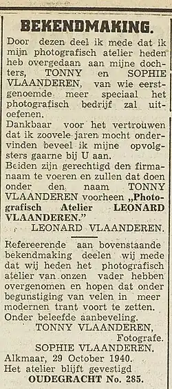 - ↑ Alkmaarsche Courant, 2. 7. 1947, s. 2 ‘Familie Vlaanderen 80 jaar fotografen’. Geraadpleegd op 11–2-2019, kranten.archiefalkmaar.nl