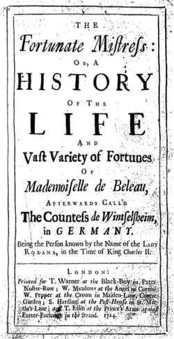 - Roxana (1724, Roxana: The Fortunate Mistress) – román o opuštěné matce, která z nezbytnosti pro obživu svých dětí přijímá úděl vydržované ženy, později však propadne touze po blahobytu a společenském postavení a jde bez morálních zábran za svým cílem, až se nakonec stává milenkou krále