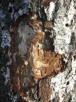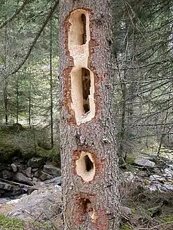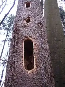 - ↑ a b ZAHNER, Volker; SIKORA, Luis; PASINELLI, Gilberto. Heart rot as a key factor for cavity tree selection in the black woodpecker. Forest Ecology and Management. 2012-05-01, roč. 271, s. 98–103. Dostupné online [cit. 2023-05-28]. ISSN 0378-1127. doi:10.1016/j.foreco.2012.01.041. (anglicky)