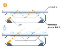 Senzor se v automobilech montuje pod čelní sklo. Je tvořen LED a fotodiodou. Paprsek z emitující diody se odráží od povrchu čelního skla a v případě, že jsou na skle kapky, se část paprsku láme a intenzita paprsku dopadajícího na fotodiodu je nižší. Frekvence paprsku může být ve viditelném spektru, nebo se jedná o infračervené záření.[1] Snímač také může automaticky měnit periodu, s níž stěrače stírají.