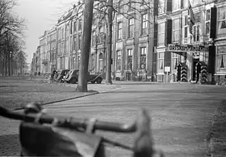 Menno Huizinga: Špionážní fotografie, dole v popředí jsou vidět řídítka Huizingova kola, žena dokázala koupit oranžovou vlajku, 1944–1945 -