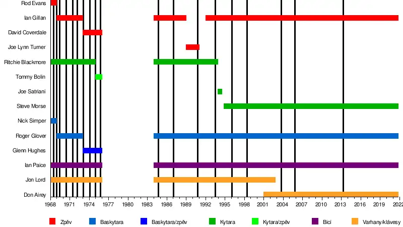 | Ritchie Blackmore Jon Lord (zemřel) Joe Lynn Turner Tommy Bolin (zemřel) David Coverdale Glenn Hughes Rod Evans Nick Simper Joe Satriani Steve Morse | |