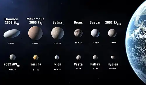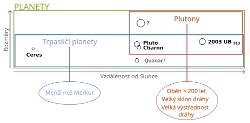- ↑ IAU zahájí proces prověření objektů blízko této hranice a jejich zařazení mezi trpasličí planety nebo do jiné kategorie.