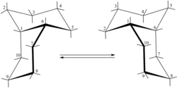 Zajímavou vlastností cis-dekalinu je jeho chiralita.[6] Jeho molekula obsahuje pouze jednu dvojčetnou osu symetrie, ale žádný střed či rovinu symetrie a je tedy chirální molekulou. Ve skutečnosti však nelze izolovat jednotlivé enantiomery z důvodu velmi rychlé přeměny jednotlivých konformerů.