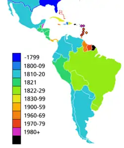 Vlastní proces osamostatnění probíhal v Latinské Americe zhruba mezi léty 1791-1830. Jako jedna z prvních kolonií vyhlásilo nezávislost Haiti (1804) a mezi posledními získala nezávislost Uruguay (1828) a středoamerické státy. Vznik nezávislých amerických států v rámci hispanoamerických válek za nezávislost byl dlouhodobým procesem a v první fázi byl ovlivněn integračními snahami Simona Bolívara (Gran Colombia). Dalším rysem bylo v některých případech oscilování mezi republikou a monarchii, se kterým je možné se setkat celkem dvakrát v případě Mexického císařství (1821-1823 a 1864-1867) a u Brazilského císařství (1822-1889). Jiným důležitým latinskoamerickým trendem bylo zachování celé řady diskriminačních politik vůči míšeneckému a domorodému obyvatelstvu a vytvoření politických oligarchií, které se rekrutovaly z řad kreolů a vládly zemím často až do poloviny 20. století.
