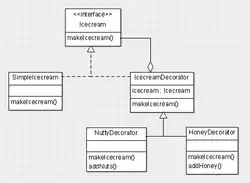 Problematika dekorátoru bude uvedena na velmi jednoduchém příkladu, aby došlo k rychlému osvojení. Je zapotřebí vytvořit zmrzlinu a k ní několik odlišných polev, které zmrzlinu ozdobí. Pokud bude použit návrhový vzor dekorátor, je zapotřebí si nadefinovat základní zmrzlinu a poté si nadefinovat polevy, kterými bude zmrzlina ozdobena, viz obrázek - UML diagram. Příklad je uveden v jazyce Java, ale k pochopení základního principu postačí znalost kteréhokoliv objektově orientovaného jazyka.