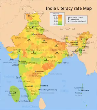 Gramotnost je obecně definována jako schopnost číst a psát v jakémkoli jazyce. Vzhledem k množství jazyků (a různých druhů písma) není tento údaj v Indii snadno definovatelný, nicméně podle sčítání lidu v roce 2011 dosáhla míra gramotnosti Indie 74,04%.[9] Jedná se nicméně o průměr, který se může významně lišit v závislosti na regionu, náboženství a pohlaví. Například na úrovni států byla nejnižší v Biháru (63,8%) a naopak nejvyšší v Kérale (93,9%). Podobně gramotnost byla výrazně nadprůměrná u křesťanů a džinistů (nad 90%) a podprůměrná u muslimů (60%). Podobně je míra gramotnosti vyšší ve městech než na venkově, stejně tak je větší procento negramotných žen než mužů.