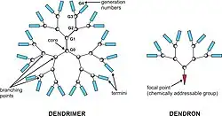 Molekuly dendrimerů jsou obvykle souměrné podle svých středů a často zaujímají kulovitý tvar. Většinou obsahují chemicky dostupnou funkční skupinu, nazývanou ohnisko nebo jádro. Rozdíly mezi dendrimery a dendrony jsou zobrazeny výše; tyto pojmy se však často zaměňují.[3]