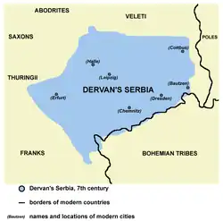 | „ | Též Dervan, vévoda národnosti Srbů, kteří byli z národnosti Slovanů a již jednou se kdysi přiklonili ke království Franků, dal se se svými [lidmi] pod ochranu království Sámova. | “ |