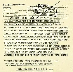 Po druhé světové válce měla každá z vojenských vlád ve spojeneckých okupačních zónách v Německu de facto na starost německé železnice na svých územích. 10. října 1946 vytvořily železnice v britské a americké okupační zóně Deutsche Reichsbahn im Vereinigten Wirtschaftsgebiet, zatímco 25. června 1947 vytvořily provincie pod francouzskou okupací Südwestdeutsche Eisenbahn. Se vznikem NSR byly tyto nástupnické organizace DRG sjednoceny a situace uzákoněna Zákonem o spolkové železnici (Bundesbahngesetz), který byl ratifikován 13. prosince 1951. Železnice v Sársku se připojila 1. ledna 1957.