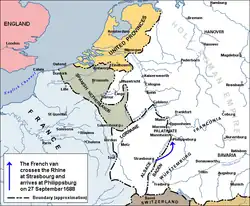 V září 1688 vstoupila francouzská vojska o síle asi 30 000 mužů do říšského Porýní. Oblehla město Philippsburg a po více než měsíci ho dobyla. Francouzská armáda postupovala dál a v rychlém sledu dobývala jedno město za druhým včetně Mohuče. Francouzi nyní ovládali oblast Rýna od švýcarských hranic téměř až ke Koblenzi. Tato agrese zmobilizovala říšská knížata a císaře. Ten odvolal část vojsk z turecké fronty a spolu s knížaty začal formovat armádu. Ludvík XIV. a Louvois se rozhodli nestavět se na odpor a místo toho provést taktiku spálené země. Mezi prosincem 1688 a červnem 1689 zničili Francouzi asi 20 měst (mj. i Špýr, Mannheim a Worms) a množství menších osad. Ponechali si několik klíčových měst a právě na jejich znovuzískání se zaměřily tři armády, které Říše zformovala. Během léta a podzimu 1689 se jim podařilo dobýt na Francouzích např. Mohuč, Bonn a Kaiserswerth. Ludvík XIV. ztratil víc, než získal.