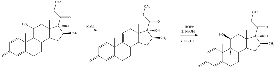 K syntéze dexamethasonu je potřeba dehydratovat 16β-methylprednisolon-acetát na 9,11-dehydro derivát.[51][52] Ten pak reaguje se zdrojem hypobromitu, například bazickým N-bromsukcinimidem, za vzniku 9α-brom-11β-hydrinového derivátu, který pak vytvoří vazbu s epoxidem. Reakcí s fluorovodíkem v tetrahydrofuranu vzniká dexamethason.