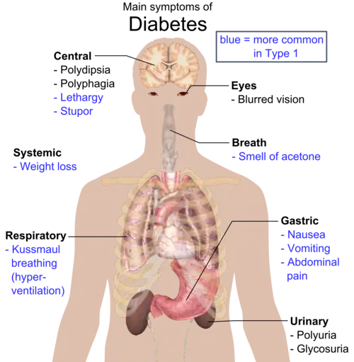 Výskyt diabetu v posledních 50 letech značně vzrostl, a to paralelně s výskytem obezity. V roce 2010 bylo zaznamenáno přibližně 285 miliónů lidí trpících touto chorobou (ve srovnání s asi 30 milióny z roku 1985). Akutní komplikací léčby je neketotické hyperosmolární kóma či laktátová acidóza. Diabetická ketoacidóza, typický projev diabetu 1. typu, je vzácná.[4]