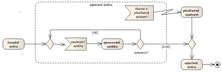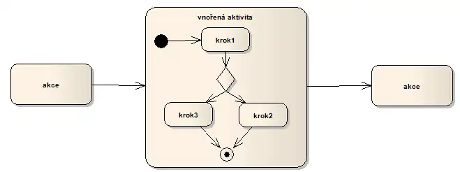 - vnořené aktivity – volání jiných procesů (aktivit), tyto aktivity mohou být reprezentovány dalším diagramem aktivit.