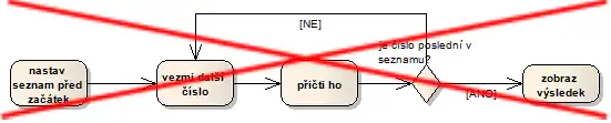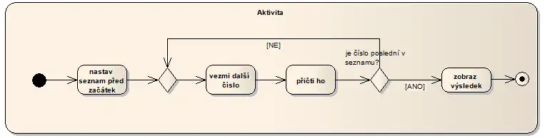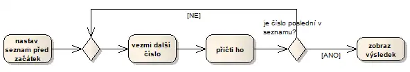 Chceme-li modelovat proces, kdy sčítáme všechna čísla v seznamu, nelze použít model na následujícím obrázku, protože před provedením kroku „Vezmi další číslo“ by se proces zastavil a čekal na příchod toku z podmínky větví „NE“.