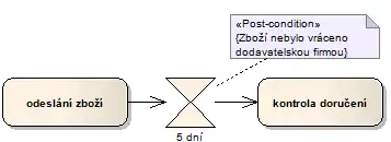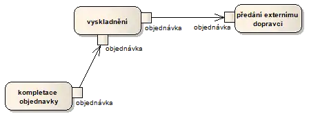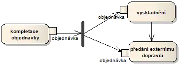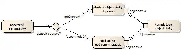 Po potvrzení objednávky a její kompletaci je kompletovaná objednávka buď předaná externímu dopravci, nebo je uložená na dočasném skladu. Oba způsoby dopravy zpracovávají jednu objednávku, ale řídící tok zajistí, že bude proveden pouze jeden z kroků (krok se provede po „přivedení“ všech řídících i objektových toků) a tím nedojde k uzamčení objednávky v druhém kroku. |