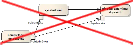 V tomto případě by v kroku „vyskladnění“ došlo ke „zkonzumování“ objednávky a krok „předání externímu dopravci“ by nebyl spuštěn, protože by nedostal na vstup objekt s objednávkou. Správně lze model nakreslit dvěma způsoby: Pokud není potřeba sledovat další řídící tok, je možné použít pouze následné objektové toky. Zejména pokud lze očekávat při „vyskladnění“ změnu dat objednávky: