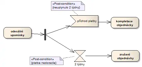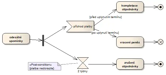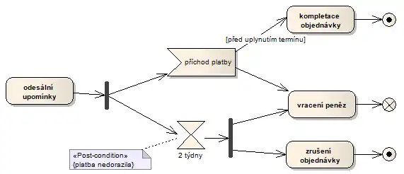 V tomto případě po výskytu události „příchod platby“ je podmíněno předání toku pouze k akci „kompletace objednávky“. Pokud dojde k vypršení termínu a platba nepřišla, objednávka je zrušena a pokud v průběhu kroku „zrušení objednávky“ dojde k příchodu platby (tj. před ukončením aktivity), je provedeno vrácení peněz (oba příchozí toky k akci „vracení peněz“ jsou aktivní). |