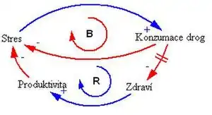 Krátkodobé a dlouhodobé důsledky mohou být odlišné. Na obrázku první smyčka zobrazuje dopad konzumace drog v krátkém období, zatímco druhá v dlouhém.