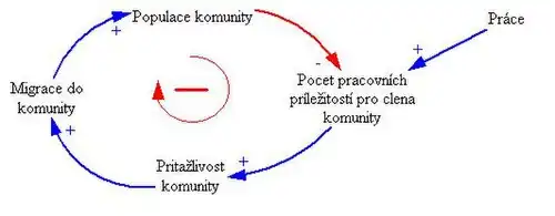 Na obrázku vpravo je jednoduchý diagram vysvětlující počet pracovních míst v komunitě a její atraktivitu. Vzroste-li přitažlivost komunity, vzroste i migrace do komunity a v jejím důsledku také populace. Při poklesu atraktivity dojede ke snížení migrace, nicméně nemusí dojít ke snížení populace. K tomu by došlo jen při poklesu migrace do záporných hodnot. K tomuto problému dochází u vztahů stavu (stock) a míry změny (rate of change). Míra změny (ukazatele jako porodnost, úmrtnost atd.) je totiž derivací vývoje stavu. Změna derivace má vliv na zakřivení křivky, neurčuje však rostoucí či klesající trend stavu.
