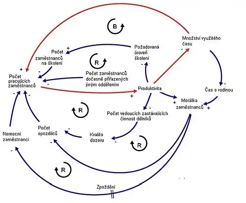 - posilující smyčky (reinforcing loops) Značí se písmenem R nebo znaménkem plus, proto se nazývají pozitivní.[zdroj?]