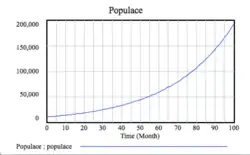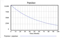 Ta ukazuje, že při zadaných hodnotách proměnných bude populace postupem času klesat, až úplně vyhyne. Pokud bychom při stejné míře porodnosti změnili průměrnou délku života na 50 let, graf by vypadal následovně:
