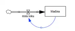 Model reprezentuje příkladové propojení toku, jakožto základního stavebního bloku modelu, který následně ovlivňuje hladinu. Tok je nastaven pomocí toku připojené proměnné míra toku. Mrak znázorňuje hraniční bod modelu – v tomto případě přítok, který teče do hladiny.