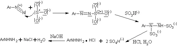 Redukčním činidlem je siřičitan sodný. V první fázi dochází k adici siřičitanového aniontu na dusík diazoniové soli. Poté dochází k adici siřičitanového aniontu a protonu na dvojnou vazbu mezi atomy dusíku. Následuje hydrolýza meziproduktu zředěnou kyselinou chlorovodíkovou. Na vzniklý hydrochlorid se poté působí roztokem hydroxidu sodného.