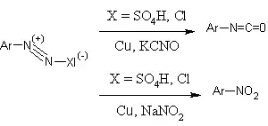 Používá se alkalický kyanid nebo dusitan v přítomnosti měďného prášku. Vznikají arylisokyanáty nebo nitroareny.