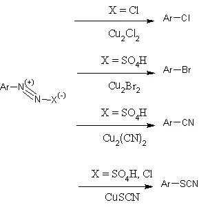 Činidlem jsou měďné soli a slouží k přípravě chlor-, brom- a kyanoderivátů arenů, popř. i arylthiokyanátů.