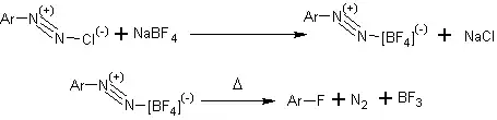 Diazoniová sůl reaguje s kyselinou tetrafluoroboritou nebo s fluoroboritanem sodným za vzniku málo rozpustného arendiazoniumtetraboritátu, který se poté opatrně termicky štěpí za vzniku fluoroderivátu.