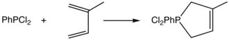 V McCormackově reakci reaguje dichlorfenylfosfin s dieny za vzniku chlorfosfoleniových iontů.[4]