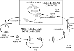 V životním cyklu diktyostelidních hlenek se nevyskytují myxomonády, ale pouze myxaméby. Ty jsou jednojaderné, haploidní, tvoří panožky a živí se pohlcováním bakterií a v nepříznivých podmínkách jsou schopné změnit se na mikrocystu. V určité fázi začnou vylučovat myxaméby tzv. akrasin (ve skutečnosti cAMP),[2] jímž se spouští agregační fáze, při níž se myxaméby složitým způsobem shlukují do kompaktního útvaru.[3] Shlukováním myxaméb vznikají tzv. pseudoplazmodia, z nichž se následně vyvíjí až 1 cm velké sorokarpy (plodničky) se stopkou. Na těchto sorokarpech dochází k produkci spor s celulózovým obalem, z nichž se následně vyvíjí nové myxaméby.[2]