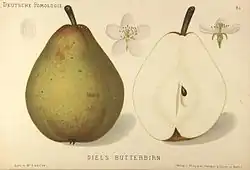 Plod je hruškovitý, baňatý, nestejný, velký (200 g z vyšších tvarů, 400 g z nízkých tvarů). Slupka drsná, při sklizni zelená, později žlutě zbarvená. Dužnina je nažloutlá jemná, máslovitá, šťavnatá, nasládlá, kořenitá. Dužnina kaménčitá.[1]