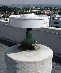 Anténa permanentní stanice GPS na betonovém pylonu střechy Německého LVermGeo RP (diferenční síť SAPOS).