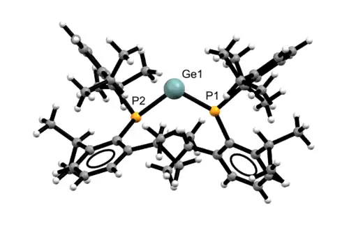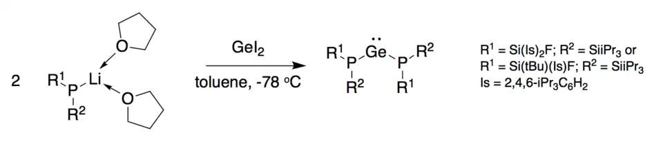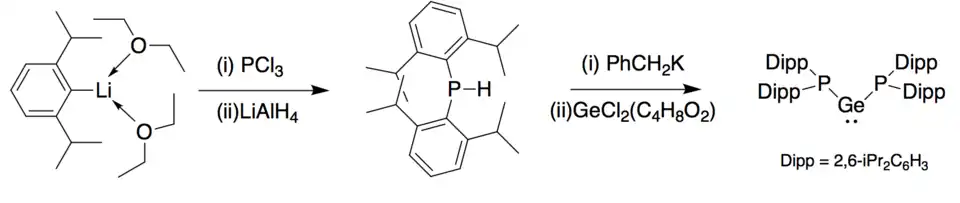 Stericky zatížený germylenový ligand (Dipp)2PH, kde Dipp = 2,6-iPr2C6H3, byl připraven adicí chloridu fosforitého (PCl3) na DippLi-(OEt2) a následnou reakcí s hydridem lithnohlinitým (LiAlH4).[1] (Dipp)2PH byl přidán k PhCH2K a chloridu germanatému (GeCl2), čímž se vytvořila sloučenina (Dipp2P)2Ge,[1] mající tmavě červené krystaly, vhodné pro rentgenovou krystalografii.[1] K identifikaci sloučeniny sloužily vícejaderná NMR a rentgenová krystalografie.[1] Tato sloučenina je za nepřítomnosti vody a vzduchu stálá.[1]
