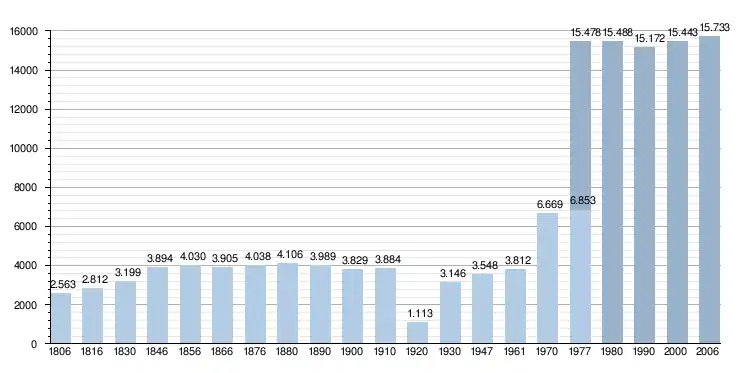 Zdroj: NIS – Poznámka: údaje z let 1806 až 1970 včetně jsou výsledky sčítání lidu z 31. prosince; od roku 1977 se uvedený počet obyvatel vztahuje k 1. lednu