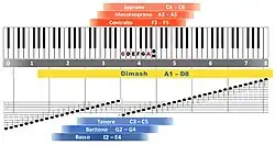 Dimash Qudaibergen je známý svým širokým hlasovým rozsahem[3] 6 oktáv a 5 půltónů (A1-D8).[1][2][4][5][214][215][216][217][218] Dimash zpívá různé hudební žánry.[219] Jeho hlavním žánrem je klasický crossover,[2][220] ale také zpívá klasickou hudbu (bel canto),[221][222] pop,[223] folk[122] a world music.[220][224] Využívá hudební prvky, vokální styly a techniky mnoha dalších žánrů,[2][218] včetně jazzu,[22][225] rocku (například píseň Screaming),[2][216][226] RnB, hudebního divadla[21][57] a rapu.[227] Typické je pro něj využití vysokých tónů (whistle register, fistule),[3][97][228] a zpěv plným hlavovým tónem.[3][229]