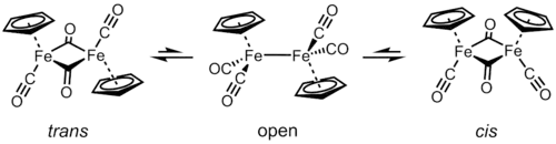 V roztocích Cp2Fe2(CO)4 vytváří dimerní polosendvičový komplex. Vytváří tři izomery: cis, trans a otevřenou formu, neobsahující můstek; tyto izomery lze odlišit podle polohy ligandů. Cis a trans izomer se liší vzájemnou polohou C5H5 (Cp) ligandů; označují se strukturním vzorcem [(η5-C5H5)Fe(CO)(μ-CO)]2, takže dva CO ligandy jsou koncové a zbylé dva tvoří můstek mezi atomy železa. Cis a trans izomery se vzájemně přeměňují s nemůstkovým izomerem, který můstkové ligandy mezi atomy železa nemá, jeho vzorec se zapisuje jako (η5-C5H5)(OC)2Fe−Fe(CO)2(η5-C5H5) — atomy kovu mají vazbu mezi sebou. V rovnovážném stavu převažují cis a trans izomery.