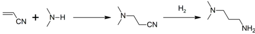 Vyrábí se reakcí dimethylaminu a akrylonitrilu (která patří mezi Michaelovy reakce) za vzniku dimethylaminopropionitrilu, který se následně hydrogenuje:[2]