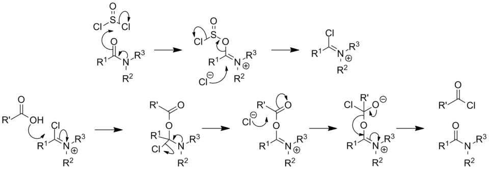 - DMF se také využívá jako katalyzátor přípravy acylhalogenidů, převážně acylchloridů, z karboxylových kyselin s využitím oxalyl- nebo thionylchloridu. Při katalýze dochází k vratné tvorbě imidoylchloridu:[21][22]