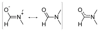 Podobně jako většina jiných amidů se u DMF vazby C-N a C-O chovají částečně jako dvojné. V infračervených spektrech se objevuje absorpční pás způsobený prodlužováním vazeb C=O na vlnočtu 1675 cm−1, zatímco u ketonu by byl blízko 1700 cm−1.[2]