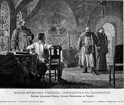 - Boris umírá. Neudržitelnou situaci se Boris rozhodně řešit sebevraždou. Vypije jed a dává poslední rozkazy. Dcera se má zachránit ukrytím v klášteře, syn Fjodor se snad díky svému mládí (šestnáct let) dočká milosti. Bojaři vytvoří říšskou radu, ale objeví se kníže Romanov se svými vojáky, kteří mu sjednají panovnickou autoritu.