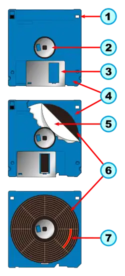 1 – vpravo otvor pro detekci HD, vlevo přepínač ochrany proti zápisu (průhledný otvor znamená zákaz zápisu), 2 – upínací část, 3 – krytka čtecího otvoru, 4 – plastový kryt, 5 – papírová vložka, 6 – magnetický nosič, 7 – sektor na disku (rozdělení není okem viditelné, nakresleno je jen pro názornost).