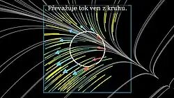 Vektorové pole na obrázku má kladnou divergenci, protože tok ven převažuje a tato vlastnost zůstane i po limitním stažení kruhu do bodu.