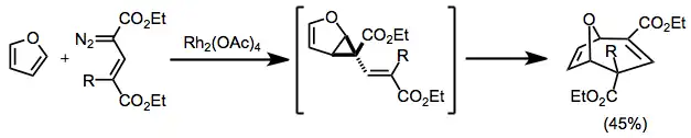 Cyklopropanace konjugovaných diazosloučenin vytvářejí divinylcyklopropany, následně se přesmykující. Při použití cyklických substrátů vznikají můstkové molekuly.[12]